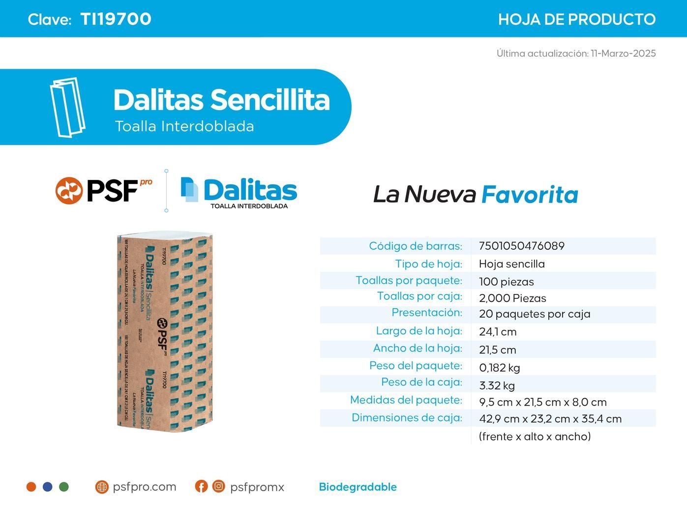 La Toalla Interdoblada marca Dalitas Sencillita ofrece un producto que brinda al usuario blancura y suavidad en cada hoja, hecho con fibras 100% recicladas, resistentes y altamente absorbentes, lo que permite un secado de manos eficiente. Ideal también para tareas de limpieza y usos múltiples.