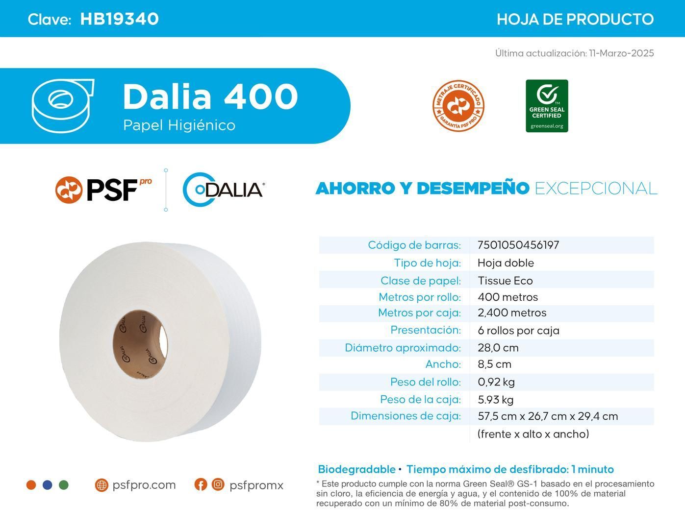 El Papel Higiénico marca Dalia® ofrece un higienico en bobina que brinda al usuario blancura y suavidad en cada hoja,papel hecho con fibras 100% recicladas además, se desfibra rápidamente por lo que es seguro depositarlo en el WC sin el riesgo de obstruir tuberías pues se desintegra por completo en el agua.
